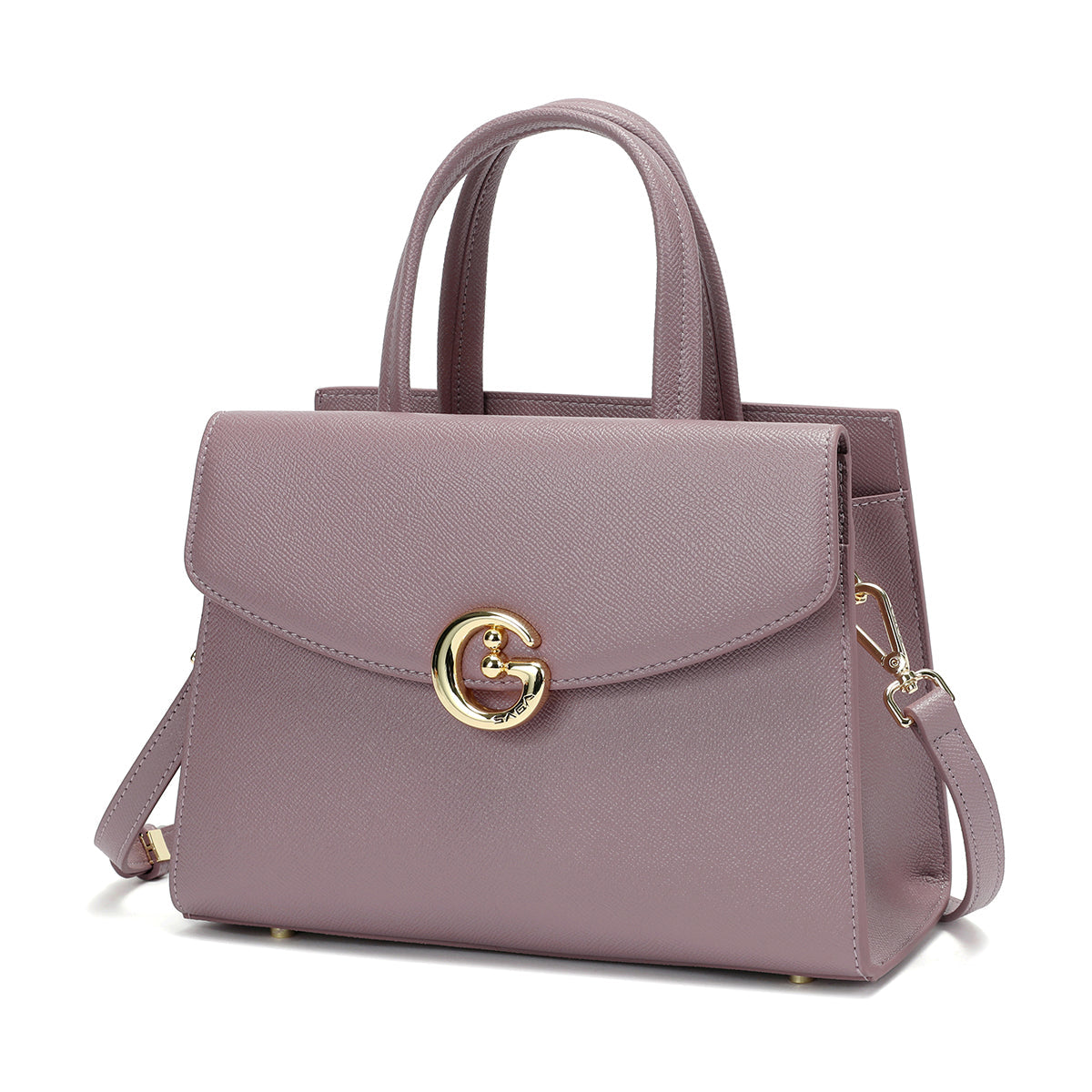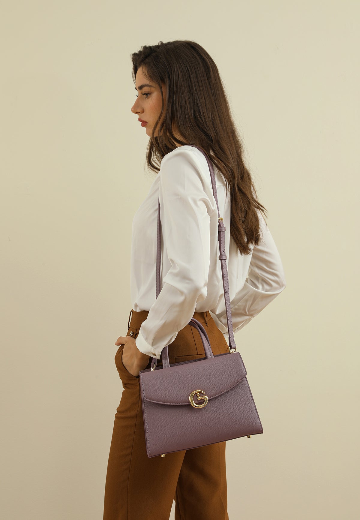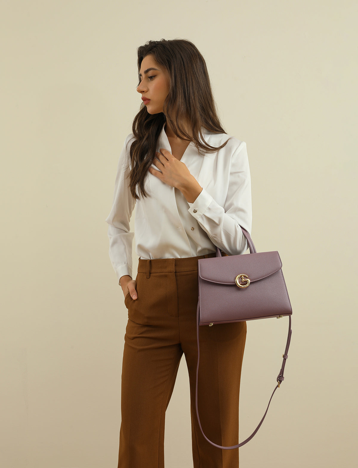 This stylish women's handbag in a mauve color features a practical design and a comfortable top handle, making it suitable for work and everyday use. It boasts a well-organized shape and ample space for carrying essentials, along with an additional shoulder strap for versatile carrying options.